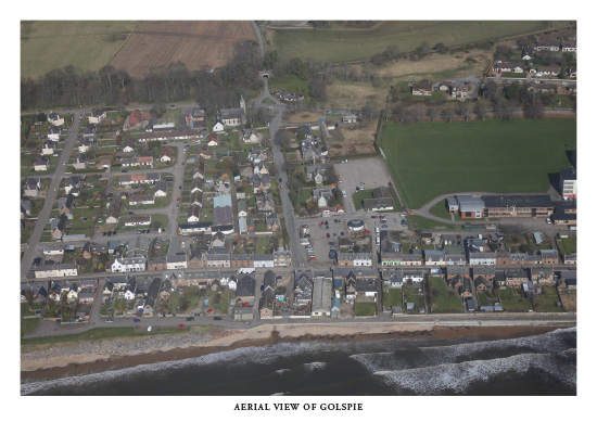 Aerial view of Golspie. Taken over the centre of the village, Fountain Road runs at right angles to the main A9 that runs through the village.