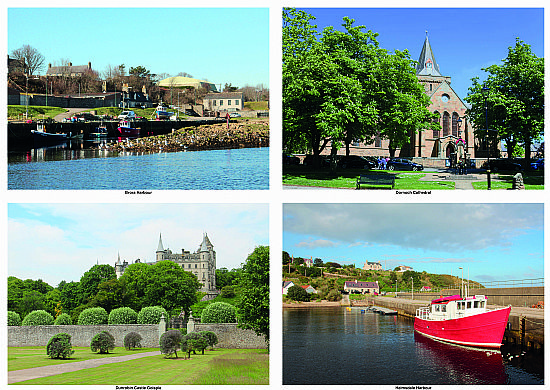 A 1000 piece jigsaw with four images in the puzzle Brora Harbour, Dunrobin Castle(Golspie), Dornoch Cathedral & Helmsdale Harbour.